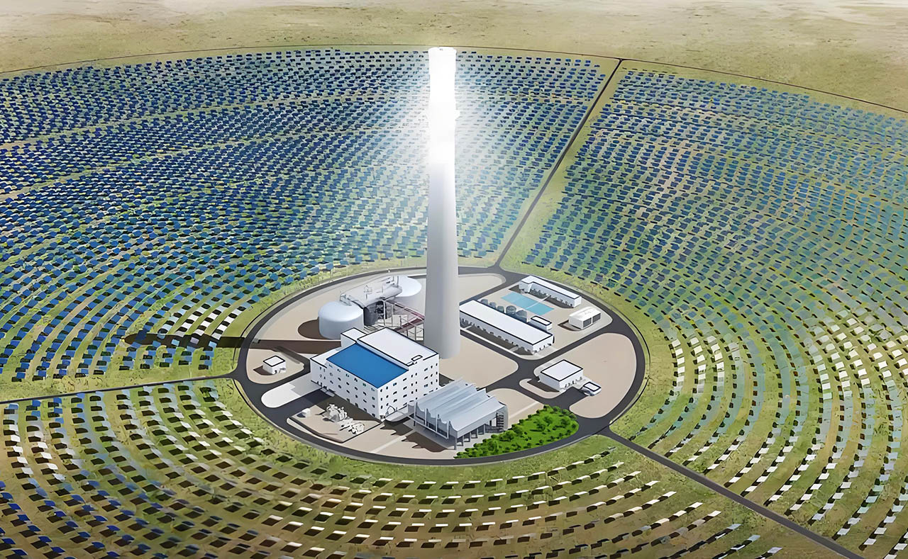 聚光太阳能发电是用许多反光镜反射太阳光到塔顶的吸热器,反光镜多达数千个至一万多个,聚集的太阳光将吸热器内的传热流体加热到600多度,传热流体在塔下蒸汽发生器将水加热成高温蒸汽,推动汽轮发电机旋转发电。