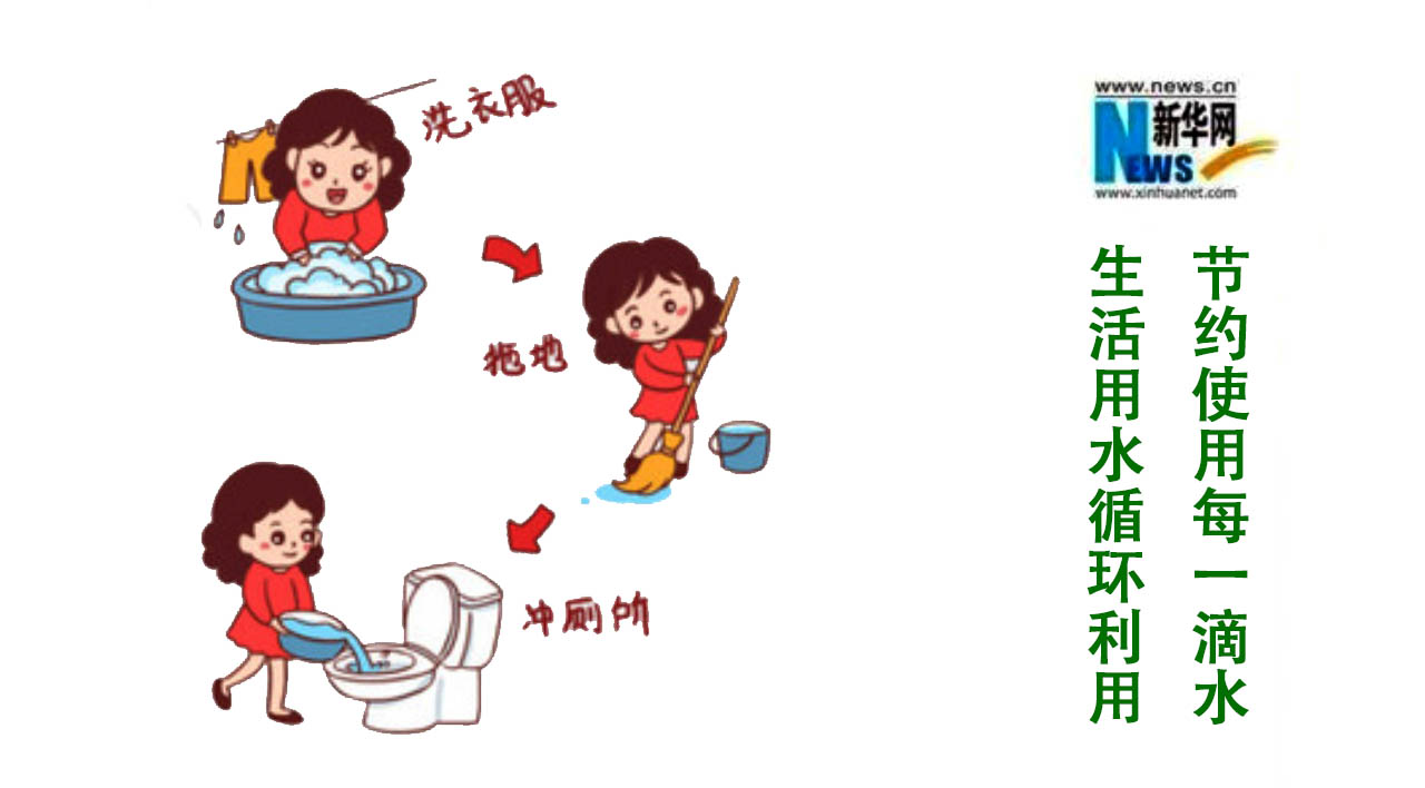 合理控制淋浴时间与水流量。将开始放出的冷水收集后用于冲厕或拖地。